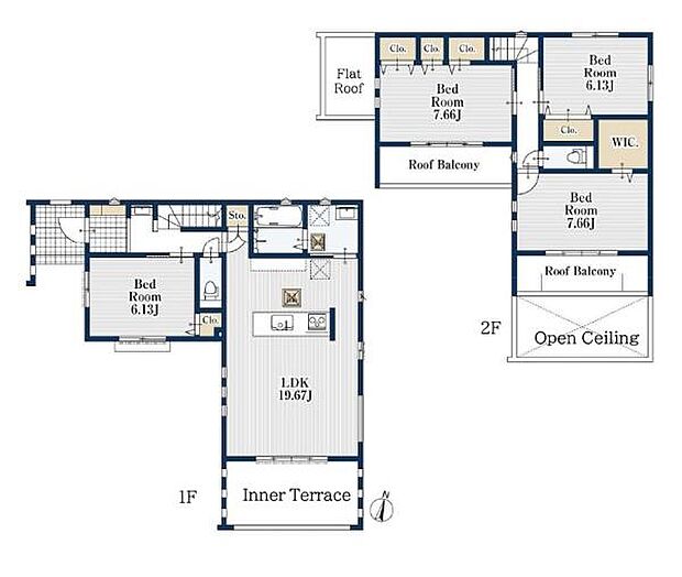 駐車スペース2台分あり(車種による)。19帖超の広々としたLDK!各居室に収納スペース付き。