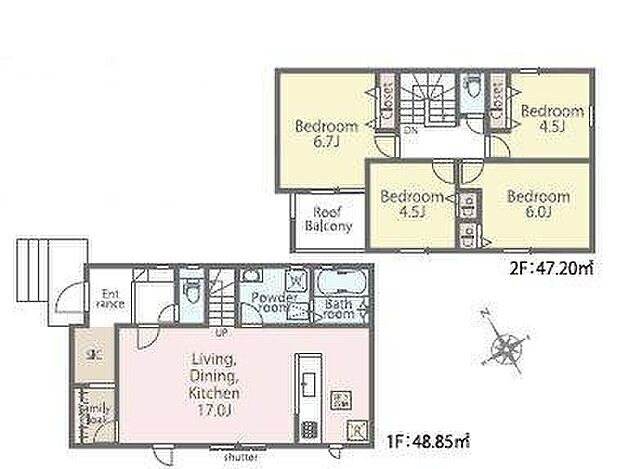 間取り内訳:リビングダイニングキッチン 17帖(1階)・洋室 4.5帖(2階)・洋室 4.5帖(2階)・洋室 6帖(2階)・洋室 6.7帖(2階)