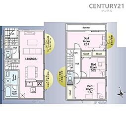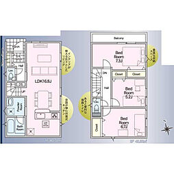 間取り内訳:リビングダイニングキッチン 16.8帖(1階)・洋室 6.7帖(2階)・洋室 7.3帖(2階)・洋室 5.2帖(2階)