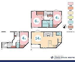 | 間取り | 3LDK 間取り内訳:洋室 4.5帖(1階)・リビングダイニングキッチン 14帖(2階)・洋室 6.2帖(3階)・洋室 4.5帖(3階) |