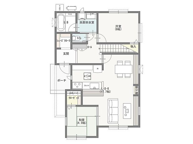• LDKは17.7帖の広さを確保。リビング上部には約4mの天井高の吹抜けを設け開放感ある明るい空間になっております。