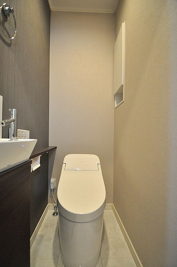 • 【1Fトイレ手洗い器付きカウンター】手洗いカウンター付き:スタイリッシュでセンスの良いトイレ空間。収納キャビネット付きの手洗い器ならお客様のご利用時にも活躍します。