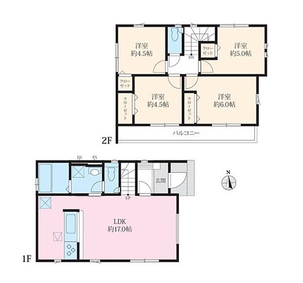 | 間取り | 4LDK 間取り内訳:リビングダイニングキッチン 17帖(1階)・洋室 4.5帖(2階)・洋室 4.5帖(2階)・洋室 6帖(2階)・洋室 5帖(2階) |