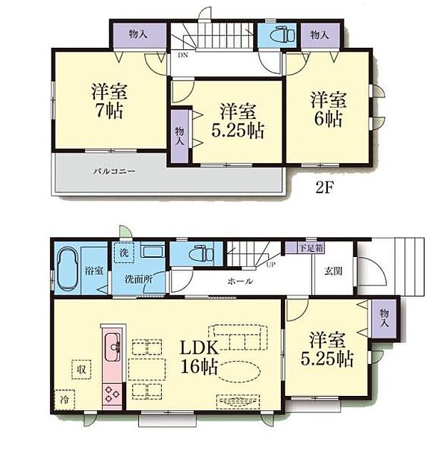 間取り内訳:リビングダイニングキッチン 16帖(1階)・洋室 5.2帖(1階)・洋室 7帖(2階)・洋室 5.2帖(2階)・洋室 6帖(2階)