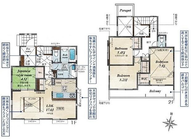 | 間取り | 4LDK 間取り内訳:リビングダイニングキッチン 17帖(1階)・和室 4.5畳(1階)・洋室 5.4帖(2階)・洋室 5.2帖(2階)・洋室 7帖(2階) |