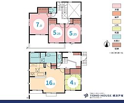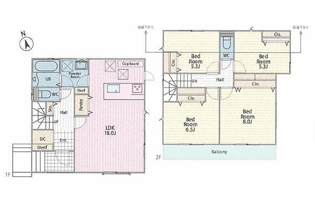 | 間取り | 4LDK 間取り内訳:リビングダイニングキッチン 18帖(1階)・洋室 5.3帖(2階)・洋室 5.3帖(2階)・洋室 8帖(2階)・洋室 6.5帖(2階) |
