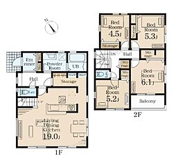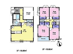 間取り内訳:リビングダイニングキッチン 18.2帖(1階)・洋室 6帖(2階)・洋室 9.5帖(2階)・洋室 6.5帖(2階)