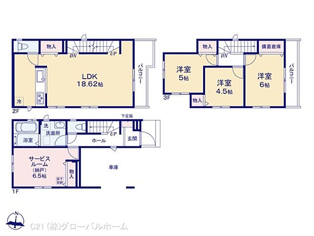 | 間取り | 3SLDK 間取り内訳:収納 6.5帖(1階)・リビングダイニングキッチン 18.6帖(2階)・洋室 5帖(3階)・洋室 4.5帖(3階)・洋室 6帖(3階) |