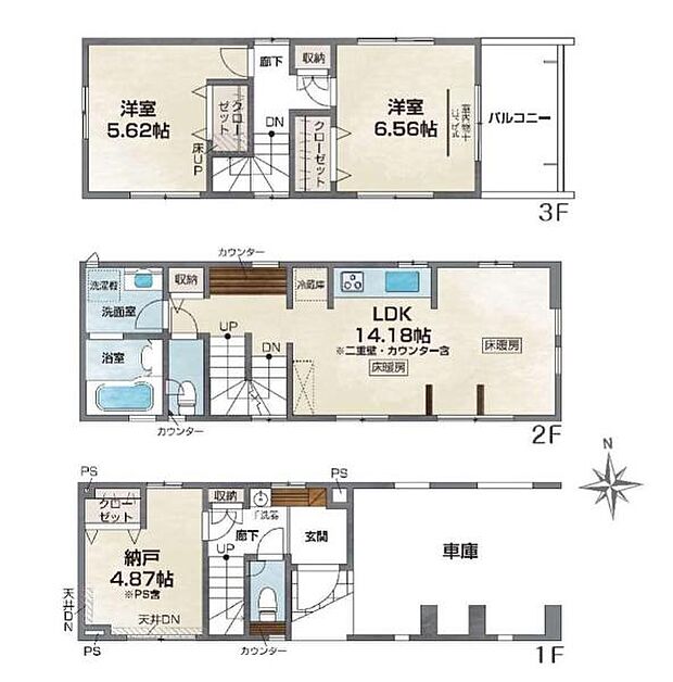 間取り内訳:収納 4.8帖(1階)・リビングダイニングキッチン 14.1帖(2階)・洋室 5.6帖(3階)・洋室 6.5帖(3階)