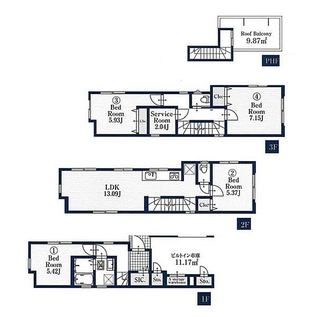 | 間取り | 4LDK 間取り内訳:洋室 5.4帖(1階)・リビングダイニングキッチン 13帖(2階)・洋室 5.3帖(2階)・洋室 5.9帖(3階)・洋室 7.1帖(3階) |