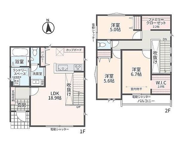 間取り内訳:リビングダイニングキッチン 18.9帖(1階)・洋室 5帖(2階)・洋室 5.6帖(2階)・洋室 6.7帖(2階)