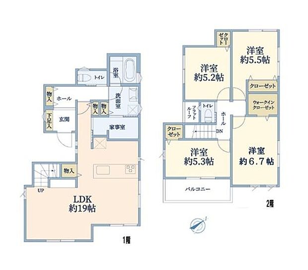 間取り内訳:リビングダイニングキッチン 19帖(1階)・洋室 5.2帖(2階)・洋室 5.5帖(2階)・洋室 6.7帖(2階)・洋室 5.3帖(2階)