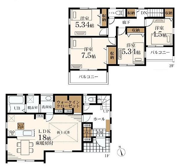 | 間取り | 4LDK 間取り内訳:リビングダイニングキッチン 18帖(1階)・洋室 5.3帖(2階)・洋室 7.5帖(2階)・洋室 5.3帖(2階)・洋室 4.5帖(2階) |