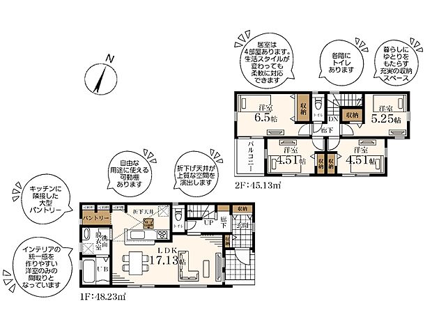 - 「建築条件付き土地」の「建物プラン例」は、土地購入者の設計プランの一例であり、プランの採用可否は任意です。