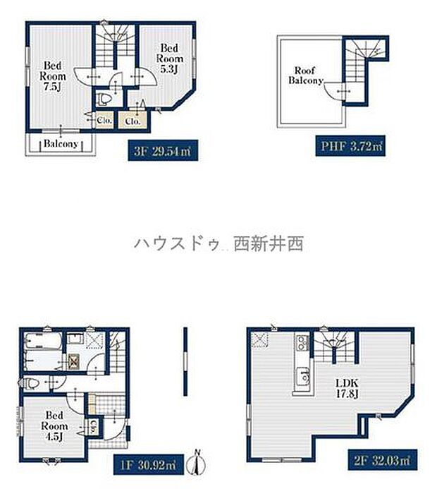 | 間取り | 3LDK 間取り内訳:洋室 4.5帖(1階)・リビングダイニングキッチン 17.8帖(2階)・洋室 7.5帖(3階)・洋室 5.3帖(3階) |