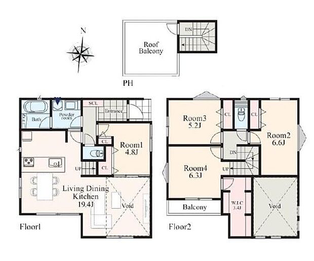 間取り内訳:リビングダイニングキッチン 19.4帖(1階)・洋室 4.8帖(1階)・洋室 5.2帖(2階)・洋室 6.3帖(2階)・洋室 6.6帖(2階)