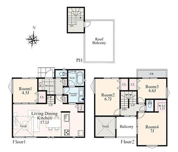 間取り内訳:リビングダイニングキッチン 17.1帖(1階)・洋室 4.5帖(1階)・洋室 6.7帖(2階)・洋室 4.6帖(2階)・洋室 7帖(2階)