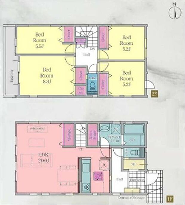| 間取り | 4LDK 間取り内訳:リビングダイニングキッチン 20帖(1階)・洋室 8.3帖(2階)・洋室 5.5帖(2階)・洋室 5.2帖(2階)・洋室 5.2帖(2階) |
