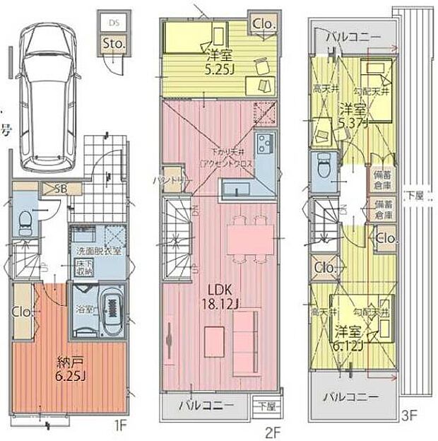間取り内訳:収納 6.2帖(1階)・リビングダイニングキッチン 18.1帖(2階)・洋室 5.2帖(2階)・洋室 6.1帖(3階)・洋室 5.3帖(3階)