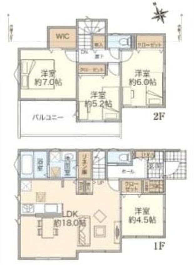 間取り内訳:リビングダイニングキッチン 18帖(1階)・洋室 4.5帖(1階)・洋室 7帖(2階)・洋室 5.2帖(2階)・洋室 6帖(2階)