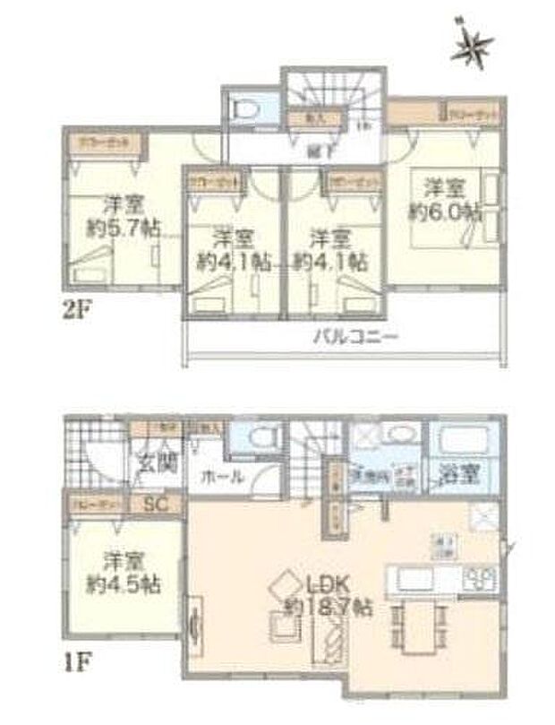 | 間取り | 5LDK 間取り内訳:リビングダイニングキッチン 18.7帖(1階)・洋室 4.5帖(1階)・洋室 5.7帖(2階)・洋室 4.1帖(2階)・洋室 4.1帖(2階)・洋室 6帖(2階) |