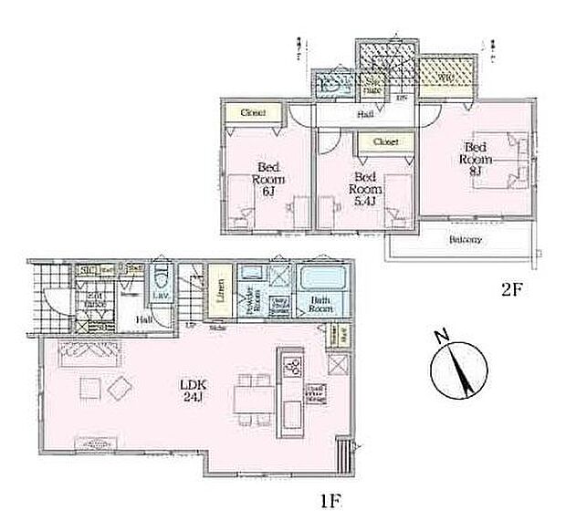 | 間取り | 3LDK 間取り内訳:リビングダイニングキッチン 24帖(1階)・洋室 6帖(2階)・洋室 5.4帖(2階)・洋室 8帖(2階) |
