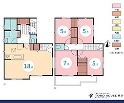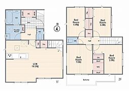 | 間取り | 3SLDK 間取り内訳:洋室 5.1帖(1階)・洋室 4.6帖(1階)・収納 4.6帖(1階)・収納 5.1帖(1階)・洋室 5.3帖(2階)・リビングダイニングキッチン 17帖(2階) |