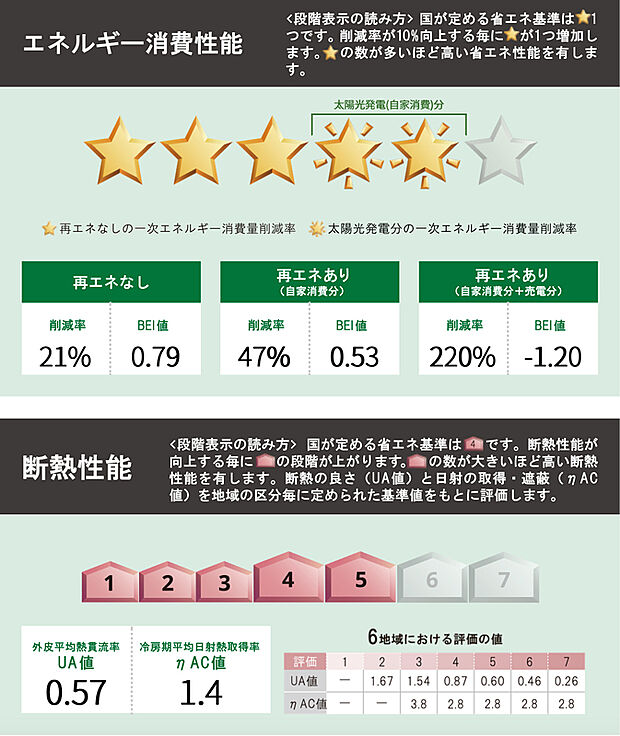 星マークの数が多いほどエネルギー消費性能が高いことを示しています。再エネ設備のない住宅は★0~★4の5段階評価、再エネ設備がある住宅は★0~★6の7段階評価となります。