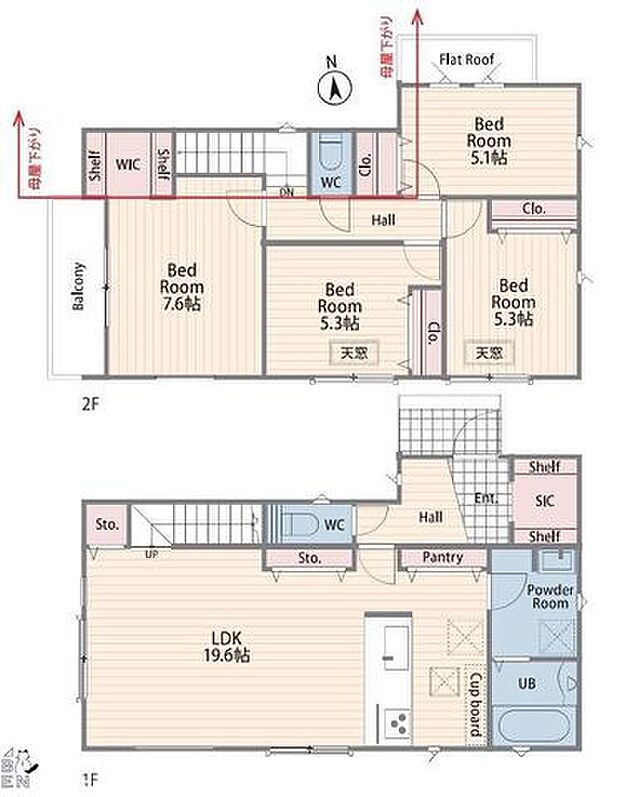| 間取り | 4LDK 間取り内訳:リビングダイニングキッチン 19.6帖(1階)・洋室 7.6帖(2階)・洋室 5.3帖(2階)・洋室 5.3帖(2階)・洋室 5.1帖(2階) |