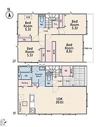 間取り内訳:リビングダイニングキッチン 20.8帖(1階)・洋室 8帖(2階)・洋室 6帖(2階)・洋室 5.3帖(2階)・洋室 5.3帖(2階)