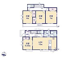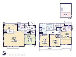 | 間取り | 4LDK 間取り内訳:リビングダイニングキッチン 17.5帖(1階)・和室 5.1畳(1階)・洋室 5帖(2階)・洋室 4.7帖(2階)・洋室 7.4帖(2階) |