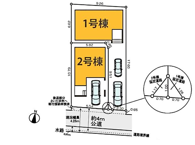 • 2号棟【前面道路幅員4m】車の通行が少ないので、静かな住環境を維持することができます。