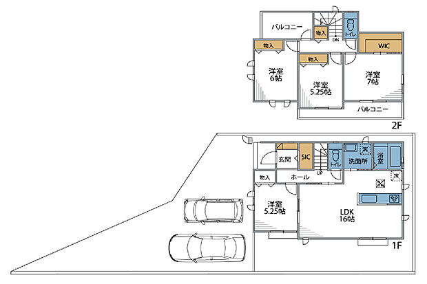 | 間取り | 4LDK 間取り内訳:リビングダイニングキッチン 16帖(1階)・洋室 5.2帖(1階)・洋室 7帖(2階)・洋室 6帖(2階)・洋室 5.2帖(2階) |