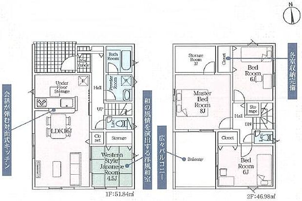 | 間取り | 4SLDK 間取り内訳:リビングダイニングキッチン 16帖(1階)・和室 4.5畳(1階)・洋室 8帖(2階)・洋室 6帖(2階)・洋室 6帖(2階)・収納 3帖(2階) |
