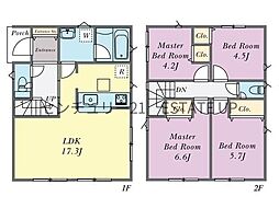 間取り内訳:リビングダイニングキッチン 17.3帖(1階)・洋室 6.6帖(2階)・洋室 5.7帖(2階)・洋室 4.5帖(2階)・洋室 4.2帖(2階)