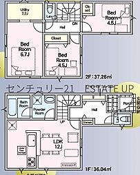 | 間取り | 3SDK 間取り内訳:リビングダイニングキッチン 12帖(1階)・洋室 6.7帖(2階)・洋室 4.5帖(2階)・洋室 4.5帖(2階)・収納 2.2帖(2階) |