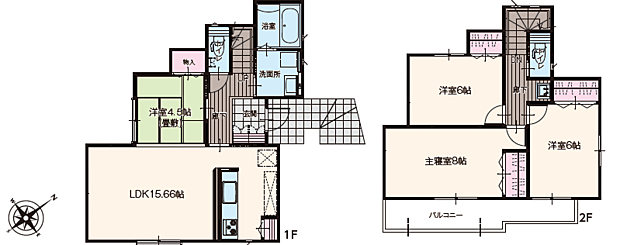 | 間取り | 4LDK 間取り内訳:リビングダイニングキッチン 15.6帖(1階)・和室 4.5畳(1階)・洋室 8帖(2階)・洋室 6帖(2階)x2 |