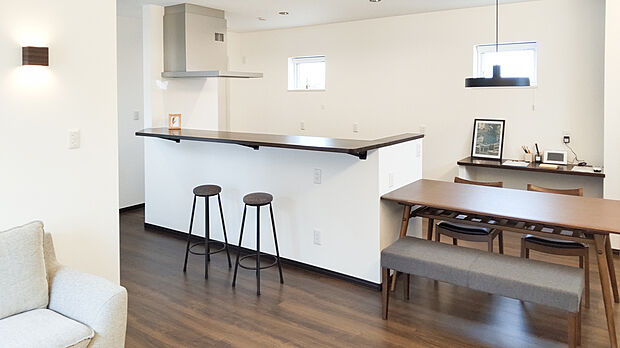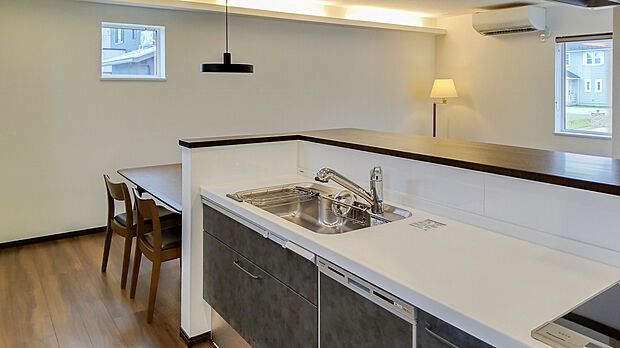 【2WAY玄関採用!】1階ホームでの出入りだけでなく、キッチン横のパントリーにも繋がっているので、買い物後の荷物でも直接行けるので運ぶ負担を減らすことが出来ます。 【ペニンシュラキッチン採用】対面式となっているので、調理中でもダイニングやリビングでくつろいでいる家族ともコミュニケーションが取り易くなっています。
