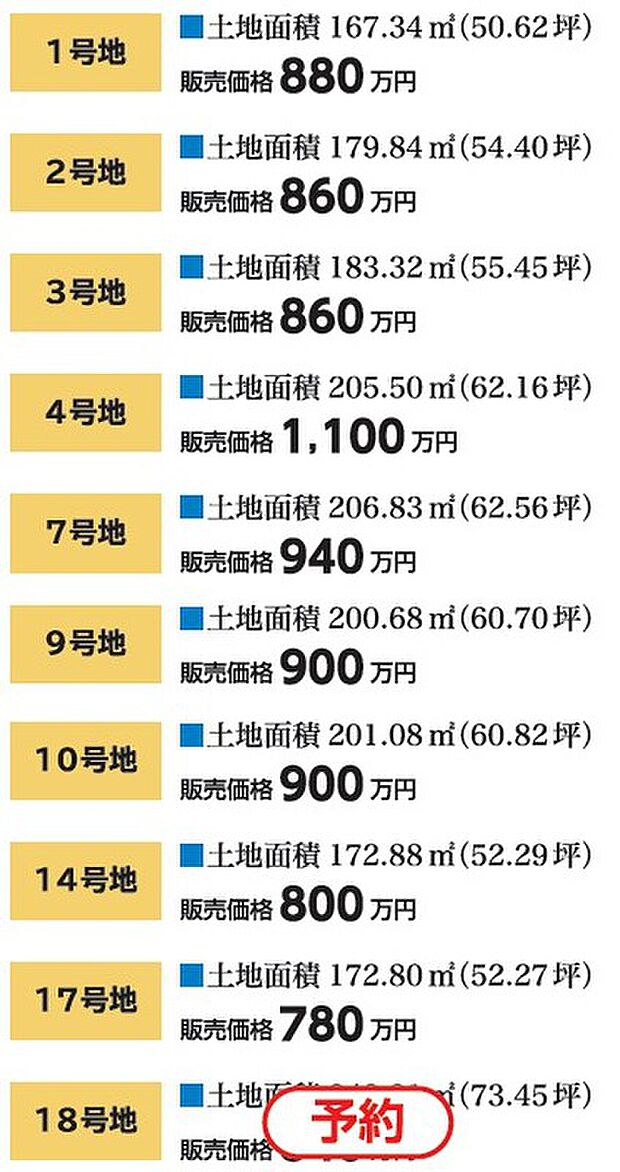 | 販売区画数 | 9区画 | 最多価格帯 | 800万円台(5区画) |