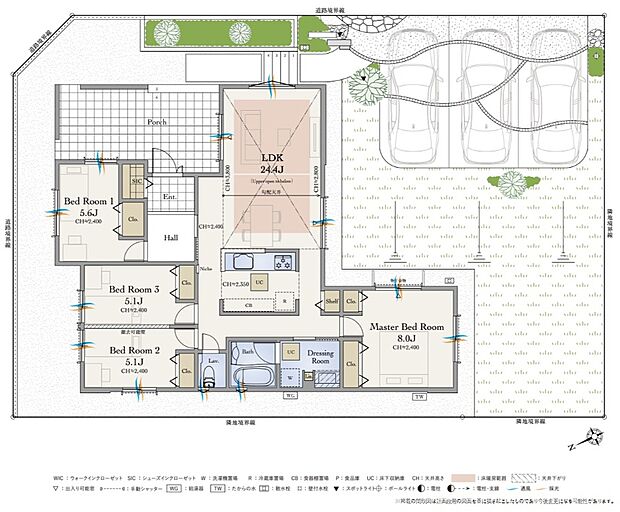 - 「建築条件付き土地」の「建物プラン例」は、土地購入者の設計プランの一例であり、プランの採用可否は任意です。