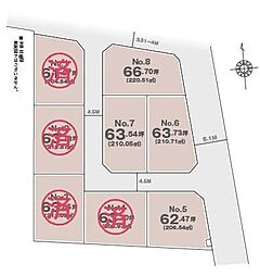 土地面積 108.55m2(4号地)、108.56m2(14号地)、108.60m2(15号地)、108.60m2(16号地)、108.60m2(17号地) 全て私道負担なし