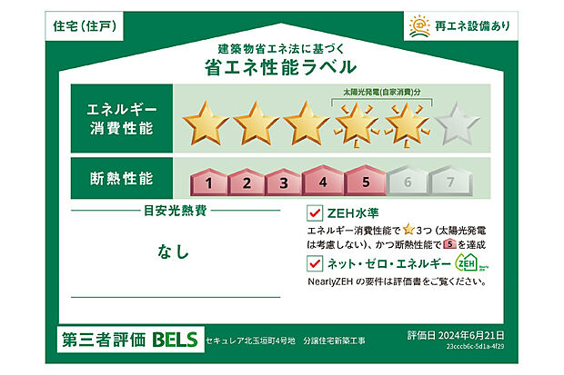 - 星マークの数が多いほどエネルギー消費性能が高いことを示しています。再エネ設備のない住宅は★0~★4の5段階評価、再エネ設備がある住宅は★0~★6の7段階評価となります。