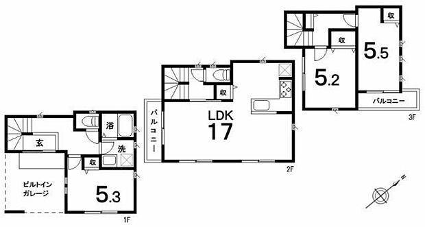 | 間取り | 3LDK 間取り内訳:洋室 5.3帖(1階)・リビングダイニングキッチン 17帖(2階)・洋室 5.2帖(3階)・洋室 5.5帖(3階) |