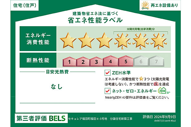 - 星マークの数が多いほどエネルギー消費性能が高いことを示しています。再エネ設備のない住宅は★0~★4の5段階評価、再エネ設備がある住宅は★0~★6の7段階評価となります。