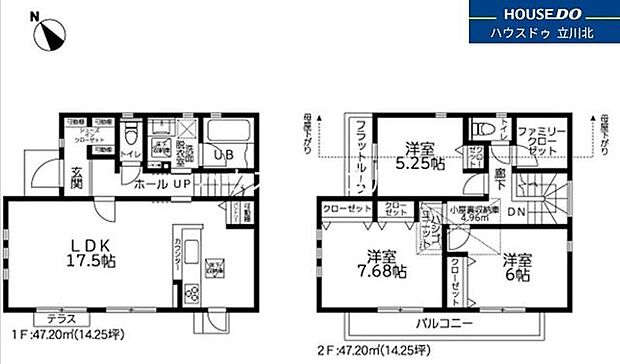 | 間取り | 3LDK 間取り内訳:リビングダイニングキッチン 17.5帖(1階)・洋室 7.6帖(2階)・洋室 6帖(2階)・洋室 5.2帖(2階) |
