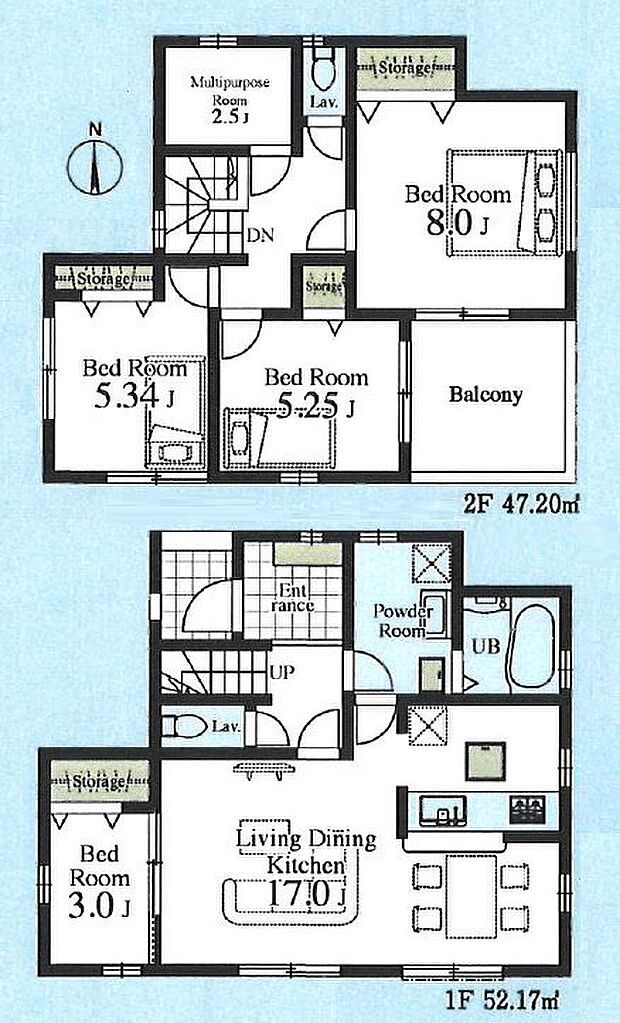 | 間取り | 4SLDK 間取り内訳:洋室 8帖(2階)・洋室 5.3帖(2階)・洋室 5.2帖(2階)・洋室 3帖(1階)・リビングダイニングキッチン 17帖(1階)・収納 2.5帖(2階) |