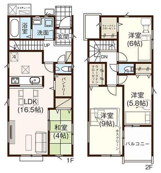 | 間取り | 4LDK 間取り内訳:リビングダイニングキッチン 16.5帖(1階)・和室 4畳(1階)・洋室 5.8帖(2階)・洋室 6帖(2階)・洋室 9帖(2階) |