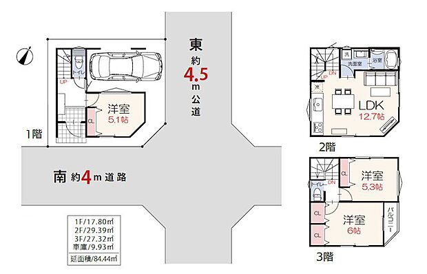 間取り内訳:洋室 6帖(3階)・洋室 5.3帖(3階)・リビングダイニングキッチン 12.7帖(2階)・洋室 5.1帖(1階)・リビングダイニングキッチン 16.7帖(1階)
