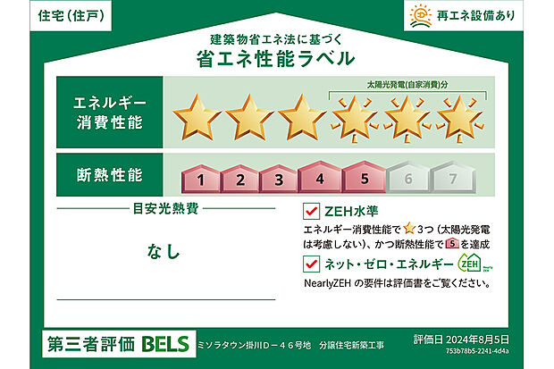 - 星マークの数が多いほどエネルギー消費性能が高いことを示しています。再エネ設備のない住宅は★0~★4の5段階評価、再エネ設備がある住宅は★0~★6の7段階評価となります。