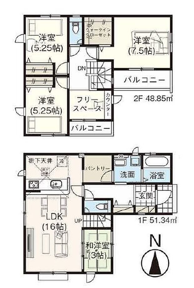 | 間取り | 4LDK 間取り内訳:洋室 7.5帖(2階)・洋室 5.2帖(2階)・洋室 5.2帖(2階)・和室 3畳(1階)・リビングダイニングキッチン 16帖(1階) |